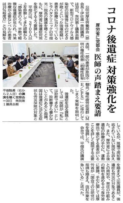 2022年3月31日の公明新聞に掲載されました。 コロナ後遺症の対策強化を/厚労省に党部会、医師の声踏まえ要請