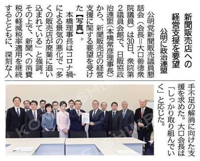 2022年12月1日の公明新聞に掲載されました。 新聞販売店への経営支援を要望/公明に政治連盟