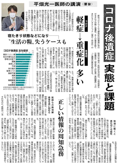 2022年4月6日の公明新聞です。 コロナ後遺症の実態と課題/平畑光一医師の講演(要旨)/軽症(コロナ)→重症化(後遺症)多い