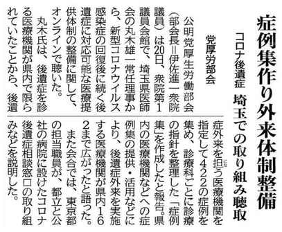 2022年4月22日の公明新聞です。 症例集作り外来体制整備/コロナ後遺症、埼玉での取り組み聴取/党厚労部会