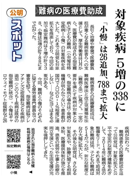 2021年11月25日の公明新聞に掲載されました。 (公明スポット)難病の医療費助成/対象疾病、5増の338に/「小慢」は26追加、788まで拡大