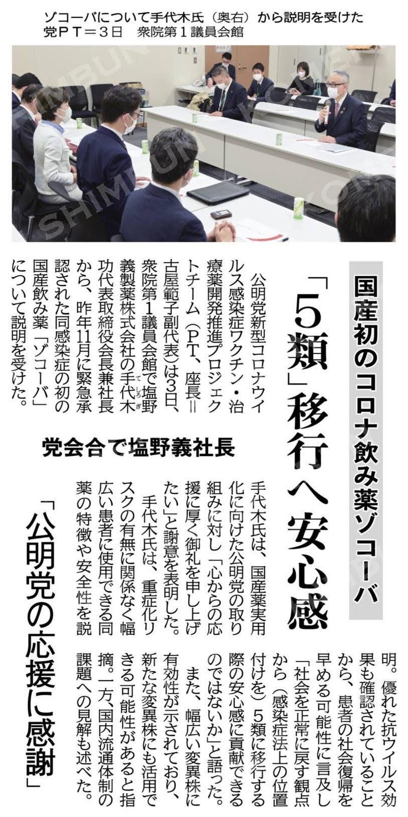 2023年2月4日の公明新聞に掲載されました。 (国産初のコロナ飲み薬ゾコーバ)「5類」移行へ安心感/「公明党の応援に感謝」/党会合で塩野義社長