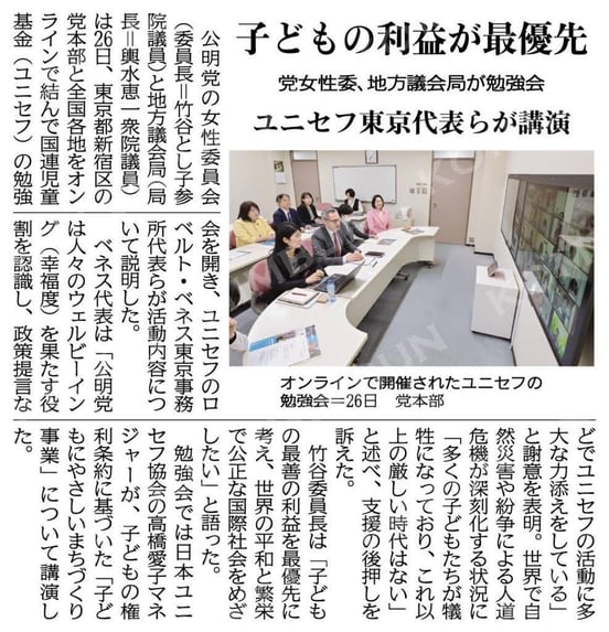 2024年3月28日の公明新聞に掲載されました。 子どもの利益が最優先/ユニセフ東京代表らが講演/党女性委、地方議会局が勉強会
