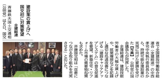 2023年12月7日の公明新聞に掲載されました。 建設業の賃上げへ国交相に対策要望/全建総連