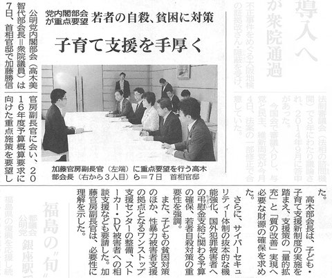 2015年8月8日の公明新聞に掲載されました。 党内閣部会が重点要望 若者の自殺、貧困対策 子育て支援を手厚く