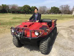 道路だけでなく、荒地、沼地、水上、雪上と、あらゆる場面で活用出来る「水陸両用車」を運転させて頂きました。この水陸両用車は、例えば水難救助において水上から陸上に車両ごと移動した上で安全に人を移送出来るなど、災害発生時に人命救助や消防活動を、自在かつ迅速に進めるために、官公庁や自治体等に配備が進められているとのことです。