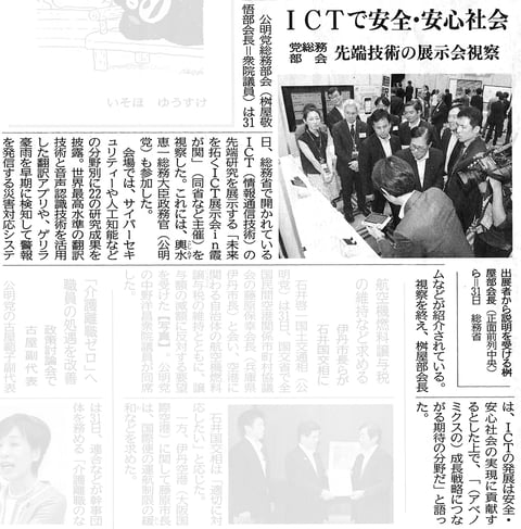 2016年6月1日の公明新聞に掲載されました。 ICTで安全・安心社会 党総務部会 先端技術の展示会視察
