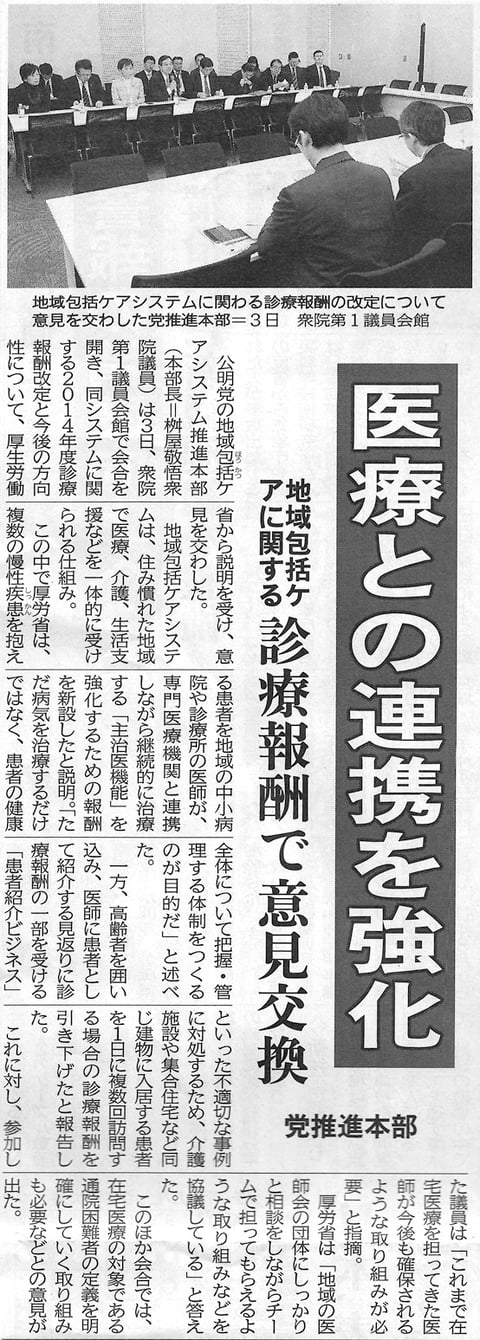 2014年3月4日の公明新聞に掲載されました。 医療との連携を強化 地域包括ケアに関する診療報酬で意見交換 党推進本部