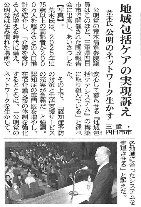 2014年5月30日の公明新聞に掲載されました。 地域包括ケアの実現訴え 荒木氏 公明のネットワーク生かす 三重・四日市市