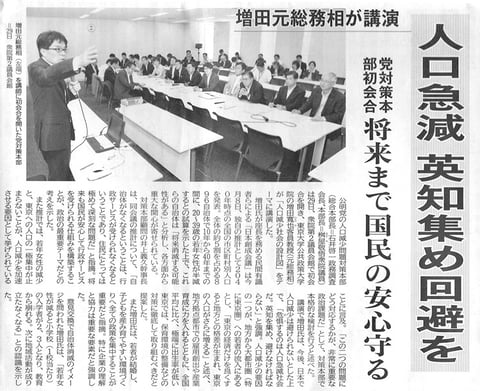 2014年5月30日の公明新聞に掲載されました。 人口急減 英知集め回避を 党対策本部初会合 将来まで国民の安心守る 増田元総相が講演