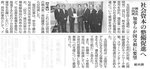 2014年5月28日の公明新聞に掲載されました。 社会資本の整備促進へ 輿水氏が同席 知事らが国交相に要望 栃木県