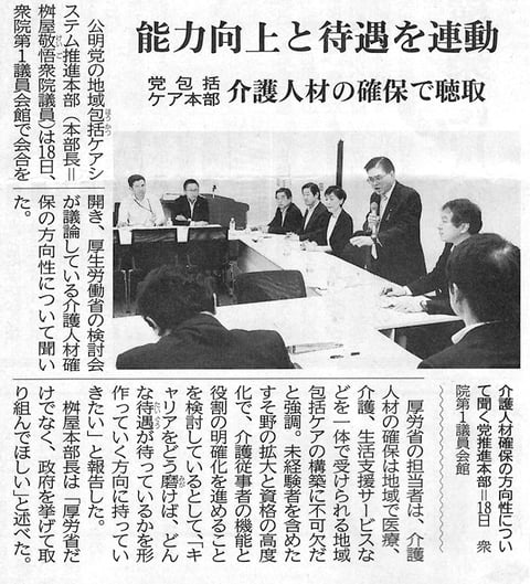 2014年9月19日の公明新聞に掲載されました。 能力向上と待遇を連動 党包括ケア本部 介護人材の確保で聴取