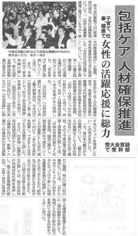 2014年9月22日の公明新聞に掲載されました。 包括ケア 人材確保促進 子育て、仕事、健康で女性の活躍応援に総力 党大会質疑で党幹部