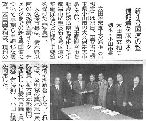 2015年3月24日の公明新聞に掲載されました。 新4号国道の整備促進を求める 太田国交相に 栃木・小山市長
