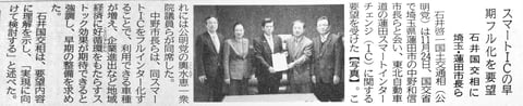 2016年12月8日の公明新聞に掲載されました。 スマートICのフル化で要望 埼玉・三芳町長が石井国交相に要望
