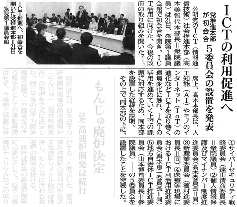 2016年12月22日の公明新聞に掲載されました。 ICTの利用促進へ 党推進本部が初会合 5委員会の設置を発表
