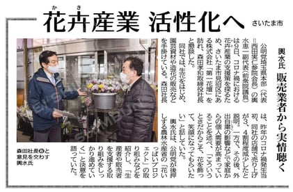 2021年3月14日の公明新聞に掲載されました。 花卉産業活性化へ/輿水氏が販売業者から実情聴く/さいたま市