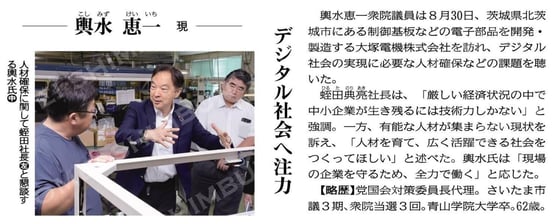 2024年9月8日の公明新聞に掲載されました。 (衆院選比例北関東ブロック(定数19) 党予定候補)現場へ動き、声を聴く/輿水恵一 現/デジタル社会へ注力
