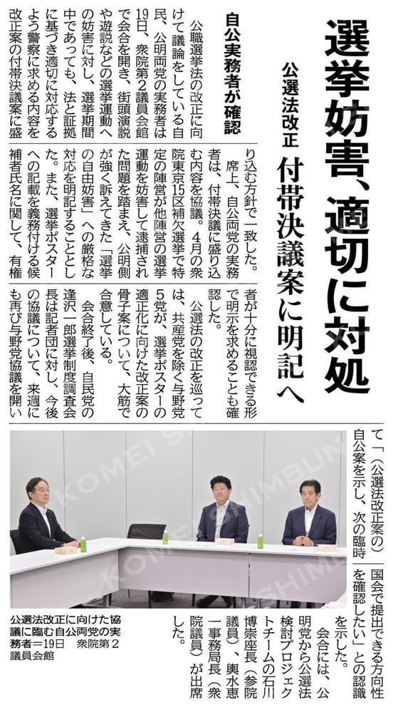 2024年9月20日の公明新聞に掲載されました。 選挙妨害、適切に対処/公選法改正 付帯決議案に明記へ/自公実務者が確認