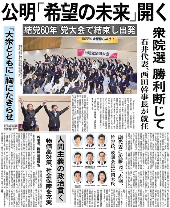 2024年9月29日の公明新聞に掲載されました。 (結党60年 党大会で結束し出発)公明「希望の未来」開く/衆院選 勝利断じて/石井代表、西田幹事長が就任