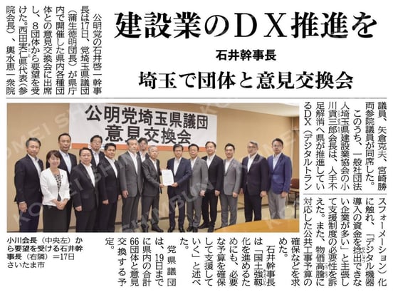 2024年9月18日の公明新聞に掲載されました。 建設業のDX推進を/石井幹事長、埼玉で団体と意見交換会