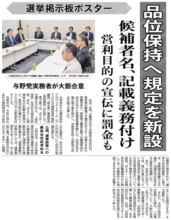 2024年9月12日の公明新聞に掲載されました。 (選挙掲示板ポスター)品位保持へ規定を新設/候補者名、記載義務付け/与野党実務者が大筋合意