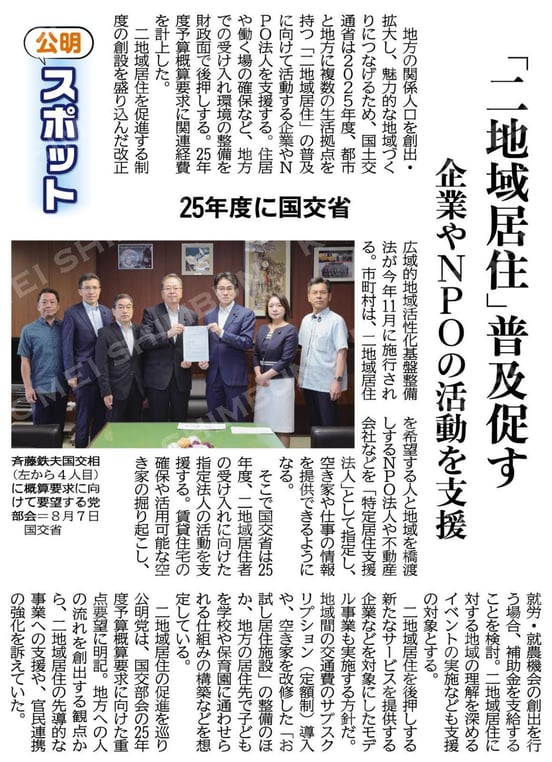 2024年9月6日の公明新聞に掲載されました。 (公明スポット)「二地域居住」普及促す/企業やNPOの活動を支援/25年度に国交省