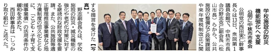 新聞掲載 · 2024/11/14 学校施設の防災機能強化へ支援/公明に中核市市長会 2024年11月14日の公明新聞に掲載されました。 学校施設の防災機能強化へ支援/公明に中核市市長会 tagPlaceholderカテゴリ: 新聞掲載, 公明新聞, 防災, 公共施設, 2024年11月